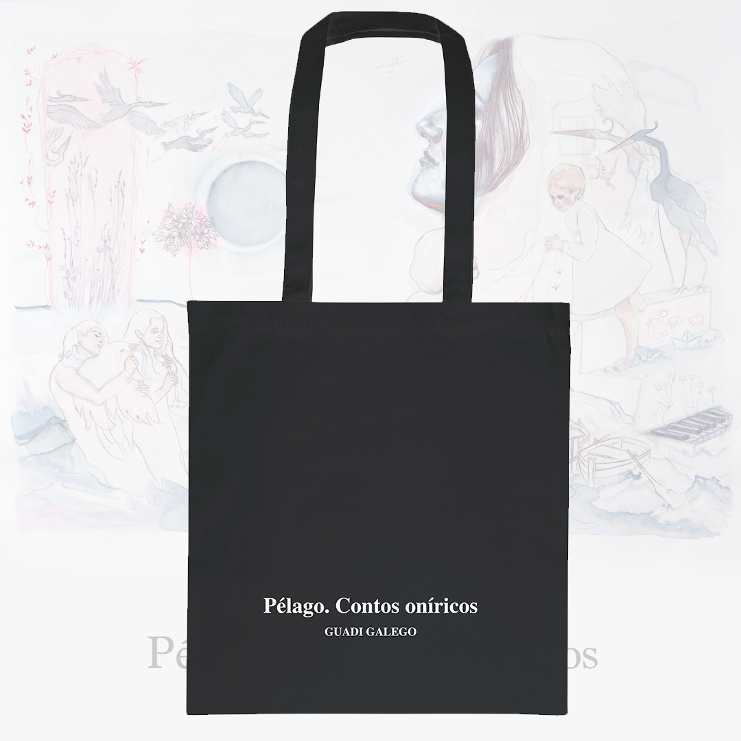 Bolsa con asas de algodón 100% canvas de 300gr con el título del nuevo disco de Guadi Galego. Pélago. Contos oníricos. Medidas 39×42 cm. Impresión personalizada realizada en Galicia.